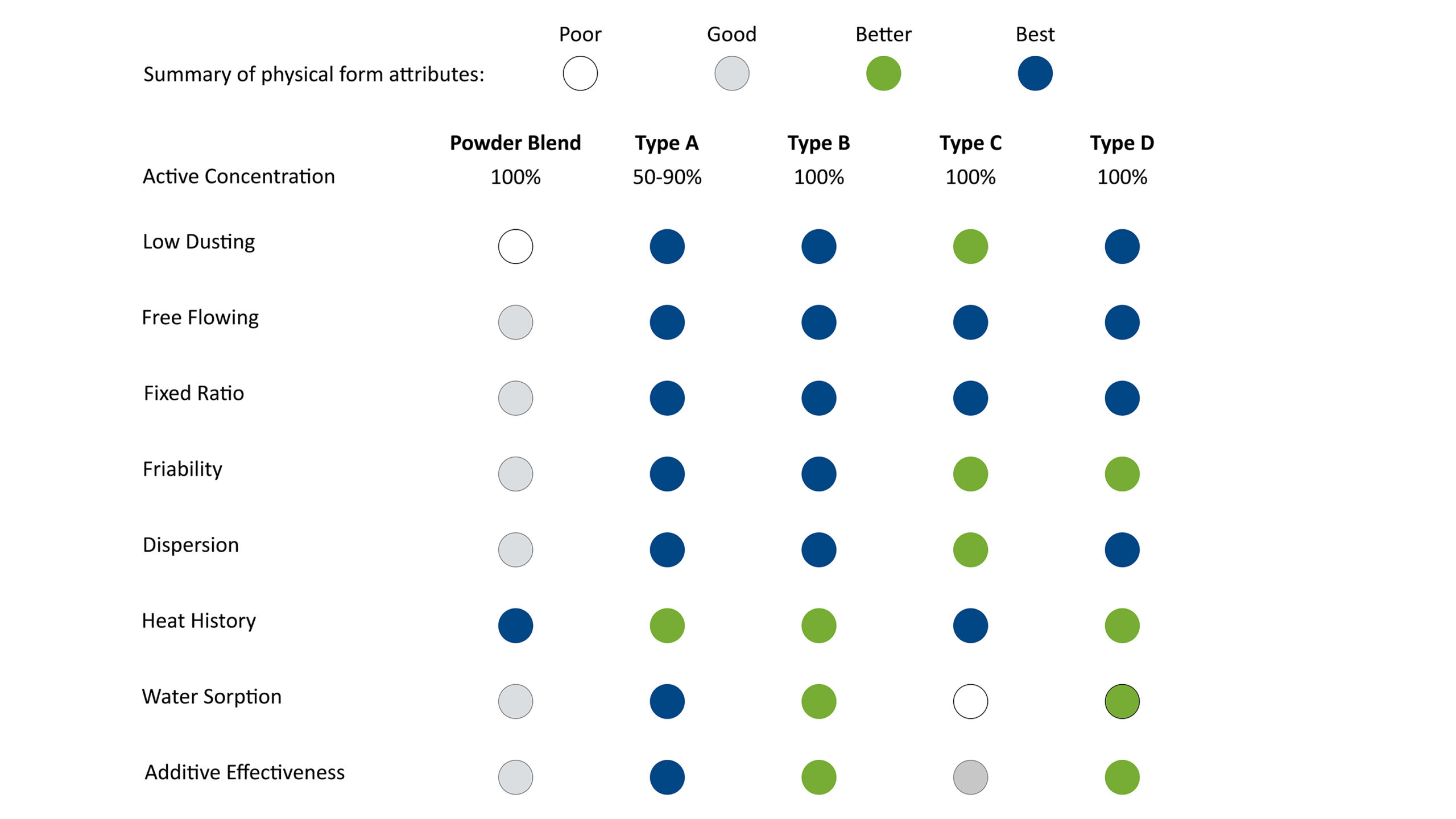 High Activity Concentrate an ultra-high concentration pelletized blend composed of 50%+ active ingredients in a polymer-based carrier. With its superior resistance to hydrolysis, Type A is the form of choice for difficult to disperse additives or complicated transfer conditions. It can be loaded into hopper cars and moved in traditional air conveying systems.