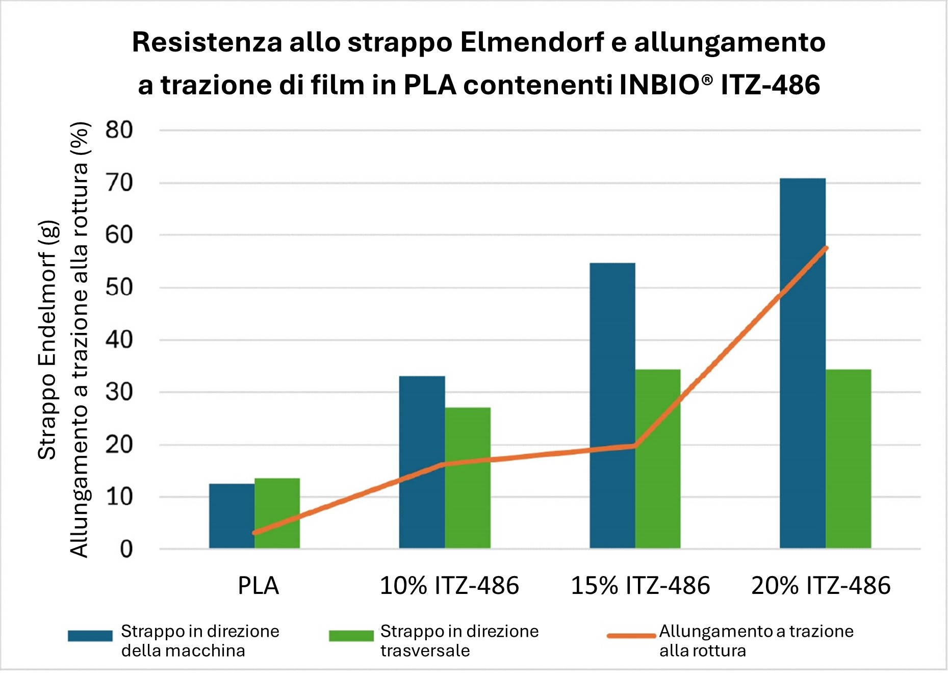 Il concentrato di biopolimeri agente indurente INBIO® ITZ-486 di Ingenia migliora le proprietà di resistenza allo strappo e alla trazione dei film sottili in PLA, consentendone l’uso in varie applicazioni. I film descritti nello studio qui sotto sono film monostrato con uno spessore di 1,5 mil e un BUR (Bottom Unwind Roll, rotolo inferiore di srotolamento) di 2,5.