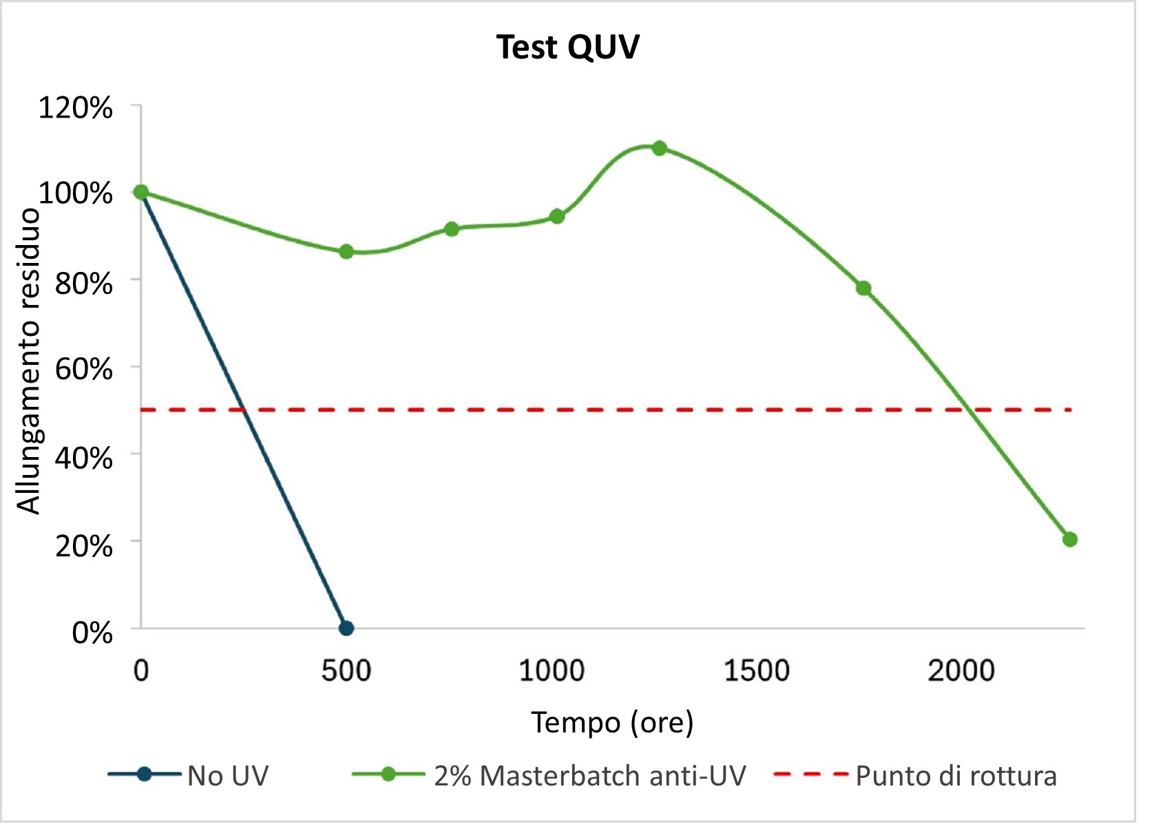 Il test QUV è un test di invecchiamento accelerato. Viene utilizzato per determinare le prestazioni dei masterbatch anti-UV, valutando le proprietà del film mantenute dopo l’esposizione ai raggi UV. Il test viene eseguito in cicli di esposizione ai raggi UV e condensazione, simulando una giornata tipo per prevedere l’esposizione reale. I raggi UV provocano danni al polimero che altera le sue prestazioni. I film che contengono il 2% del masterbatch anti-UV di Ingenia mostrano un’eccellente conservazione delle proprietà meccaniche rispetto ai film di riferimento dello stesso spessore che non contengono masterbatch anti-UV.