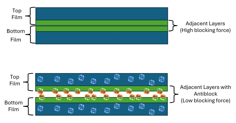 Blocking describes the adhesion between adjacent layers of film caused by Van der Waal’s interactions between amorphous regions in the polymer. Antiblocking agents form microscopic bumps on the surface of the film to create space between adjacent layers that reduce the Coefficient of Friction and facilitates easier separation of layers.