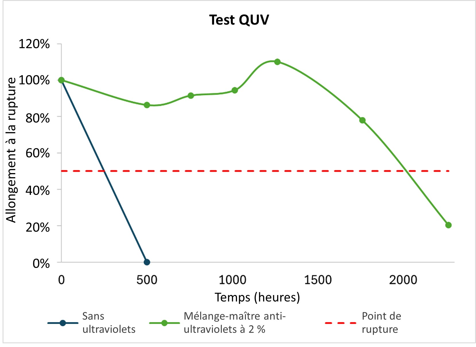 Le test QUV est une méthode d’essai accéléré de vieillissement climatique. Il est utilisé pour déterminer les performances des mélanges-maîtres anti-ultraviolets en évaluant les propriétés conservées du film après exposition aux rayons ultraviolets. Le test est réalisé par cycles d’exposition aux ultraviolets et de condensation, simulant une journée type afin de prédire l’exposition réelle. Les rayons ultraviolets endommagent le polymère, ce qui altère ses performances. Les films contenant 2 % de mélange-maître anti-ultraviolets Ingenia présentent une excellente rétention des propriétés mécaniques par rapport aux films de référence de même épaisseur qui ne contiennent pas de mélange-maître anti-ultraviolets.