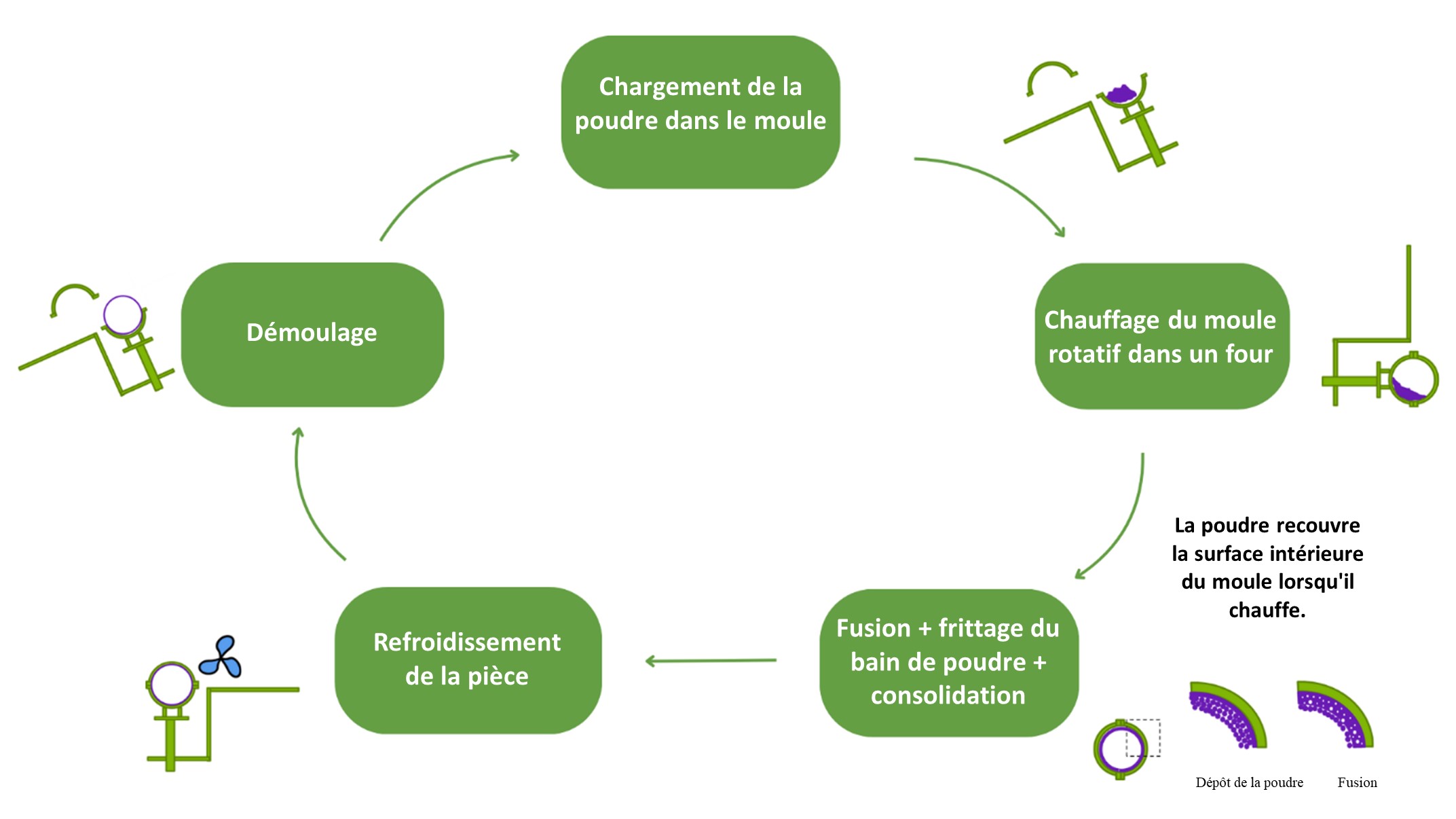 Le procédé de rotomoulage permet de fabriquer des pièces creuses en ajoutant de la poudre dans un moule et en chauffant ce dernier. Le procédé type est décrit ci-dessous.