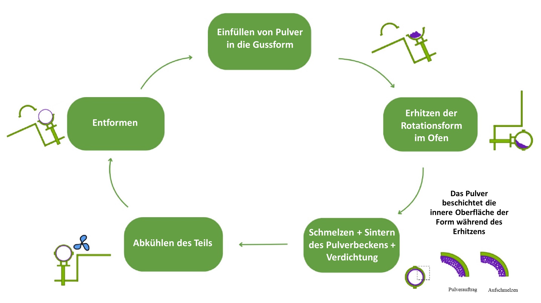 Beim Rotationsform-Verfahren werden Hohlkörper durch den Zusatz von Pulver in eine Gussform und der Erhitzung der Gussform erzeugt. Das typische Verfahren wird unten stehend hervorgehoben.