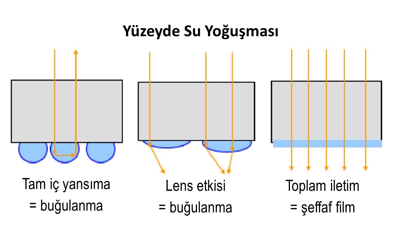 Buğu önleyiciler polimere dahil edilir ve yüzeye geçer. Bunlar, su damlacıkları ile ambalaj arasındaki yüzey gerilimi farkını azaltan hidrofilik bir kısma sahiptir. Yoğuşan su damlacıkları, yüzeyde berrak görünen sürekli bir su tabakası halinde yayılır.